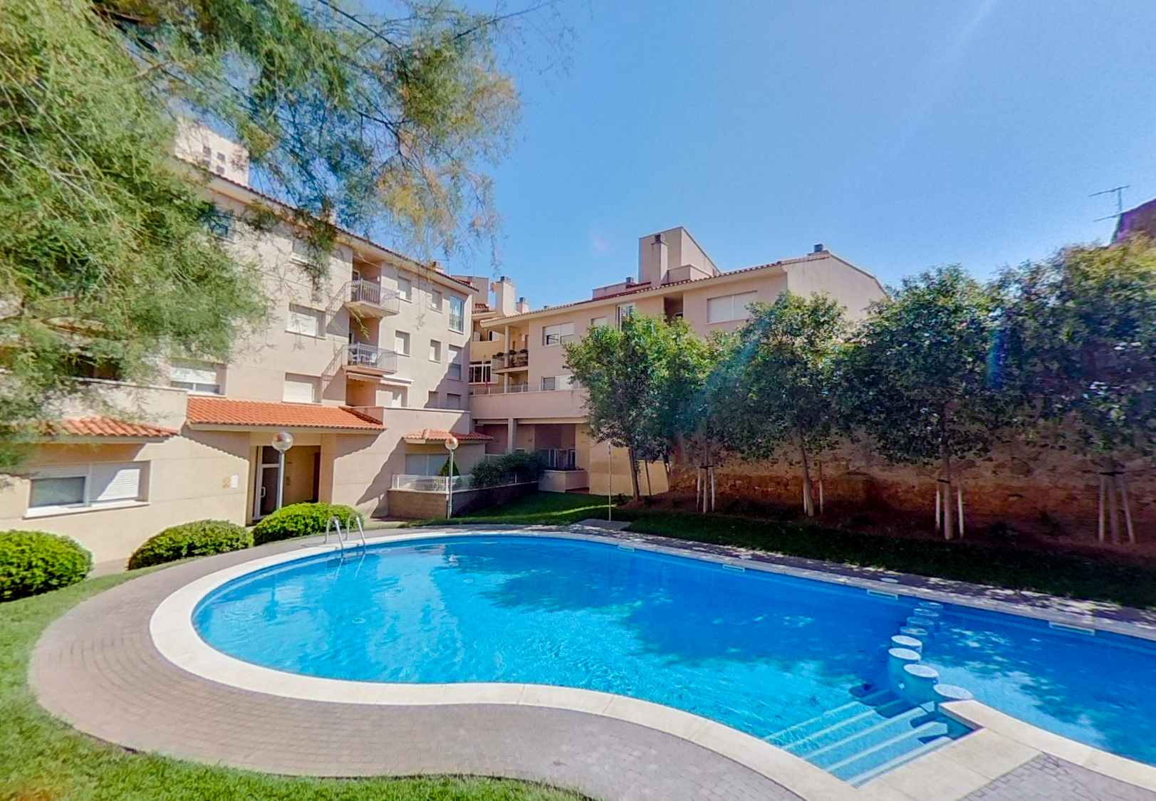 El complejo comunitario con zonas ajardinadas y piscina.